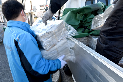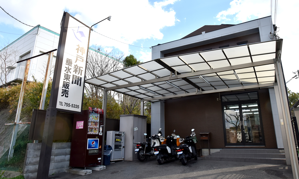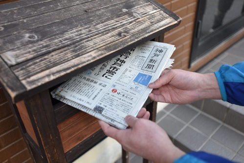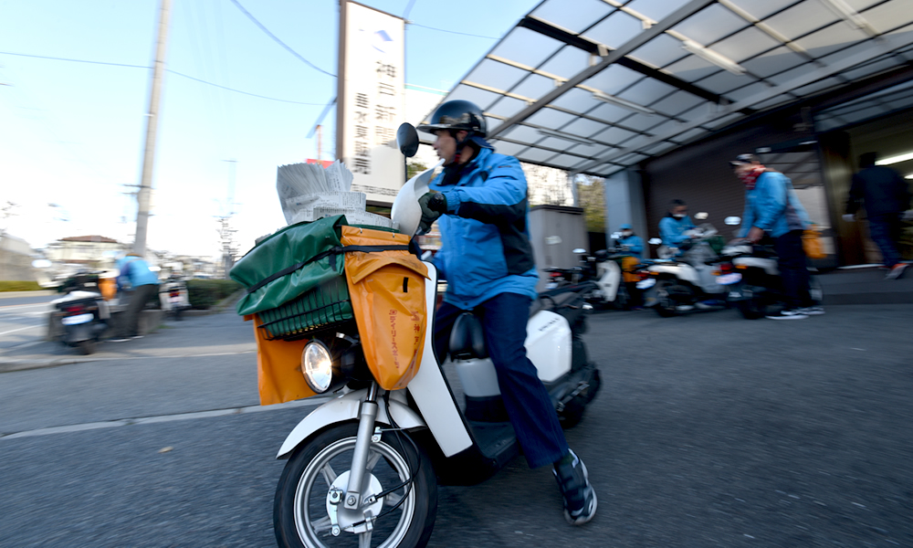 バイクに乗って購読いただいているご家庭に、新聞を届けてもらいます。